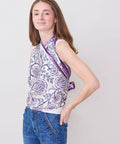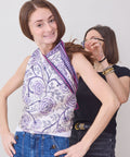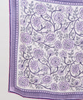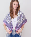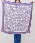Last Chance Textile's popular Ramble design gets upgraded in a beautiful silk twill and a 35" square size. This size of silk scarf is as popular with cowboys in Wyoming as it is with the French masses, and can be worn easily in a multitude of of ways. Violet and off-white coloring with a thin red trim. 100% silk with hand rolled edges. Hand wash or dry clean.