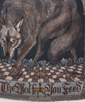Drawing inspiration from a wide range of sources, Savage wants to highlight the near-extinction of the gray wolf in the US due to a program fueled by human prejudice and fear. The title references an ancient Cherokee legend - that every one has two wolves fighting inside of them. One is angry, greedy and resentful while the other is kind, peaceful and harmonious. Which wolf will win? The one you feed. The date noted on the design is 1872, referencing the creation of Yellowstone National Park. Inspiration from folk art and an amalgam of cacti species run throughout the design and there are references to symbols from fraternal societies including the Eye of Providence, the Golden Fleece and the pillars of strength. Hand-painted parcheesi boards reference simpler times from the 19th century, while the naïve chipmunk references a second, pertinent legend.