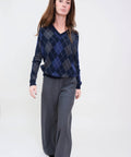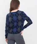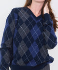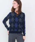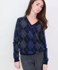 Tailored v-neck cashmere sweater in a playful argyle design of rich blues and grey. Classic yet modern. Pair with denim or wool trousers for a tailored mix of color and pattern. Ribbed trim with exposed seam detailing. 100% cashmere. Hand wash, lay flat to dry. 1=XS 2=Small 3=Medium 4=Large. Designed for an easy fit. Lindsay is 5'6" and wearing the size 1/XS.