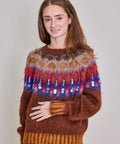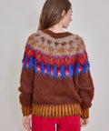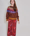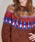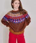 Defined by the bold prints and modern neutrals we've come to love from this brand, Maria Cher certainly delivers with this alpaca blend sweater. Vintage inspired fairisle details around the yoke, but elevated with the addition of sequins and paillettes. Dreamy and soft with a fluffy texture. Ribbed trim. 74% Suri alpaca, 22% Merino wool, 4% polyamide. Hand wash, dry flat. Lindsay is 5'6" and wearing the Small.