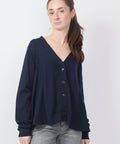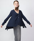 Mixed media cardigan with attitude from Meimeij. V-neck button front with a swingy panel on the sides and back that adds movement. Wear open over a tee or closed as a top. Front: 100% virgin wool, Back: 70% polyester, 28% viscose, 2% elastane. Hand wash or dry clean. Sizing translates as 38=US2, 40=US4, 42=US6, 44=US8, 46=US10. Made in Italy. Lindsay is 5'6" and wearing the 38. Ella is 5'5" and wearing the size 40.