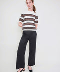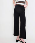 No one needs to know how comfortable these pants are. Palina is a pull-on style with smooth waistline and a wide, fluid leg. Slash pockets with a clean, neat back. Mid rise, they fit beautifully through the hips and fall to a beautiful line that is polished and smart for day and can be dressed up at night. 6/8 Length is great with flats/sneakers or for the petite gals. Made of a high performance fabric - a black jersey that has some structure to it. 95% polyester, 5% polyurethane. Machine wash cold, inside out. Hang dry. 10.5" rise, 21" leg opening, 27" inseam.