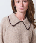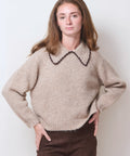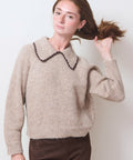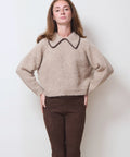 Sweet as can be pullover sweater from The Great provides a cozy, hand knit feel. Made of a textured and super soft alpaca blend, this top features a slightly oversized collar adorned with a delicate contrast trim. The set-in sleeves and easy fit make this sweater perfect for layering or wearing on its own. 89% Alpaca, 11% Recycled Polyamide. Dry clean only. Sizing: 0=XS, 1=S, 2=M, 3=L. Lindsay is 5'6" and wearing the size 0.