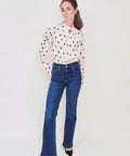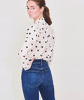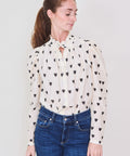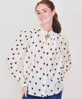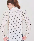 Cotton-silk blend shirt from Alix of Bohemia is hand-block printed with a heart motif. Individually cut by hand, this top has tapered puff sleeves and a feminine ruffled collar. Dress up or down. Layers nicely under a jacket. 75% Cotton, 25% Silk. Dry clean. Lindsay is 5'6" and wearing an XS.