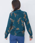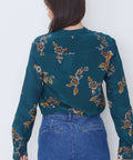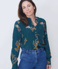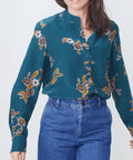 A beautiful fall floral blouse from Vanessa Bruno. An ochre-hued floral motif pops off the peacock blue background. The fabric is a flowy viscose/silk blend, the Fable blouse has a banded collar, button front with a straight body and straightforward sleeve. 65% viscose, 35% silk. Designed for a slim fit. Hand wash or dry clean. Jenna is 5'8" and wearing the size small.