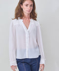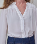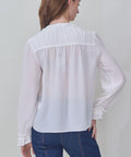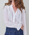 Feminine and then some. Go Silk's Girly blouse gives just the right amount of ruffle, with a banded collar with a ruffled edge, placket and sleeve cuffs. The body is made of a crinkled silk chiffon, with a v-neckline and covered buttons. Slight gathering at the yoke adds some extra ease. Lindsay is 5'6" and wearing the XS.