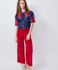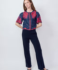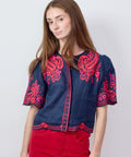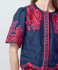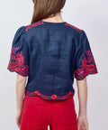 Stunning top from Christy Lynn with dark navy background and high contrast red & pink embroidery. Ornate paisley floral motif adorns the chest, sleeves and hem showcasing the designers meticulous attention to detail. Front button placket with scalloped edges and short sleeves with a slight gather at the shoulder. Cropped length provides a modern proportion allowing it to pair effortlessly with high waisted denim. Unlined. 100% Linen. Dry clean only. Lindsay is 5'6" and wearing an XS.