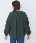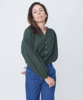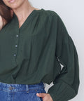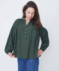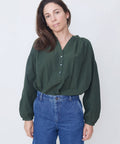 An original and a favorite style from Vanessa Bruno, Nipoa always comes back. This loose blouse exudes bohemian elegance. It has a v-neckline with a dropped shoulder, a sleeve that flows just enough, and a half-button front. Made here in a microstripe dark green that gives the light & soft fabric a bit of dimension. Runs generously. 100% cotton. Machine wash cold/gentle, lay flat to dry. 34=XS 36=Small 38=medium 40=Large. Jenna is 5'8" and wearing the 36.