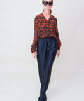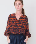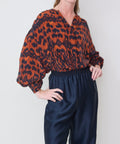 Gorgeous silk blouse from Maria Cher takes a walk on the wild side. Flowing body, full sleeves and banded collar couple with a covered placket to keep things sleek. Large button cuffs add additional drama. Wear with the coordinating Bonny skirt for head to toe pattern, but also looks great with denim. 100% silk. Dry clean only.  Lindsay is 5'6" and wearing the XS.