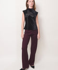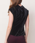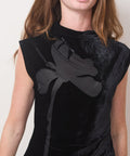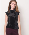 A slim black velvet top with a high neck, sleeveless and a sheer floral detail that lightens up the look without revealing too much. Made from a stretchy velvet fabric. Machine wash cold, lay flat to dry, or dry clean. Runs true to size. Lindsay is 5'6" and wearing the XS.
