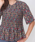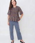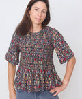 Cotton seersucker top from The Great in a vintage inspired tapestry print. Smocked body with relaxed t-shirt style sleeves and a peplum. Single back button close at the neck. Not designed to be fitted, but rather for an easy and textured fit. Throw on over a pair of wide leg denim for an easy transitional outfit. 100% Cotton. Dry clean. Sizing: 0=XS, 1=S, 2=M, 3=L. Jenna is 5'8" and wearing the size 1.