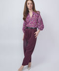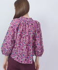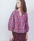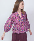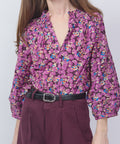 Quintessential Apiece Apart styling embodies this flowy blouse with feminine details. Subtle 3/4 length puff sleeves with horizontal pleating combines with a ruffled v-neckline. Bold floral pattern completes the look. Front button closure. 80% cotton, 20% silk. Dry clean. Lindsay is 5'6" and wearing an XS.