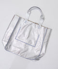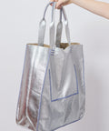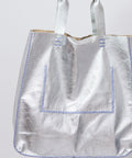 Big tote energy. This slouchy metallic tote is your throw-everything-in-and-go hero. Lightweight yet roomy, it’s built to handle daily chaos with ease—groceries, laptop, extra sweater, mystery items you forgot were in there. The soft, flexible shape molds to your side, while sturdy handles make it comfy to carry all day. Delightfully unstructured.  internal pocket and tie at the top to secure.  Measures 16.5" x 15" x 5.9".  Made of upcycled leather with contrast stitching.