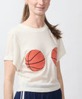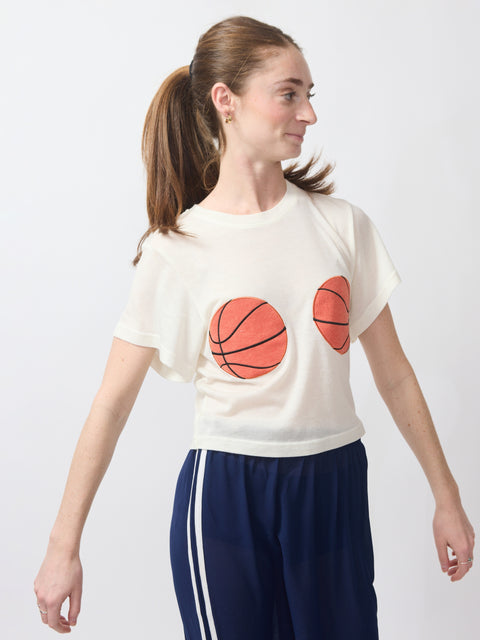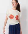 Nothing but net! This cropped, creamy-soft tee features two bold basketball graphics right up front—sporty, cheeky, and absolutely not here to play defense. Easy fit, major bounce. Shoot your shot. FYI this fabric is really REALLY soft. Lindsay is 5'6" and wearing the XS.