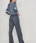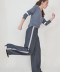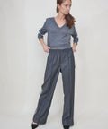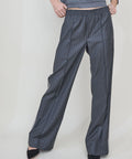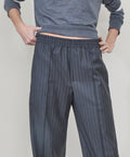 Tailored, old Hollywood style trouser from WE-AR4 with menswear inspired details. Elastic waistband provides comfort and a true fit, but the pinstripe wool with contrasting side stripe really elevates these pants. On-seam side pockets, stitched front crease and a faux fly. 100% virgin wool. Dry clean. Lindsay is 5'6" and wearing an XS.