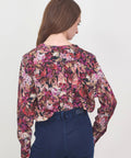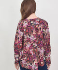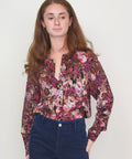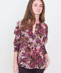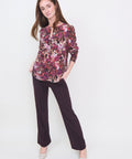 Fall florals abound with this beautiful printed silk blouse from Momoni. It has a round neck with a covered front placket and mother-of-pearl buttons at the sleeve cuffs. A beautiful choice for a more serious look, but easy to dress down with jeans and boots. 100% silk. 40=XS 42=Small 44=medium 46=Large. Dry cleaning recommended. Lindsay is 5'6" and wearing the 40.