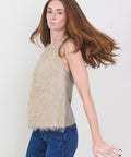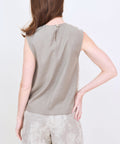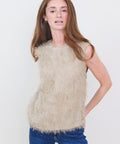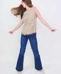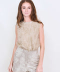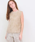 Cheeky in nature, innovative by design. This top from Alysi is made with a fringed viscose fabric and has a matching flannel fabric for its backside. A distinctive choice to add texture to your look. Sleeveless with a round neck and a keyhole opening in the back of the neck. 68% viscose, 16% wool, 16% polyester. 40=XS 42=Small 44=Medium. Dry cleaning recommended. Lindsay is 5'6" and wearing the size 40.