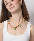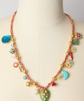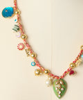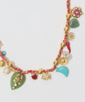This adjustable cotton cord necklace is bursting with 18 tiny charms — a joyful mix of hand-painted grigris and colorful enamel pendants, playfully spaced with gold-plated pearls and finished with a one-of-a-kind purple centerpiece that steals the show. Adjustable from 16" to 22".