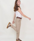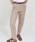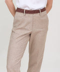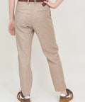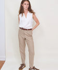 A sophisticated trouser from Momoni made in a beige chevron wool blend. Classic mid-rise, zip front with belt loops, slash front pockets. Ankle length with a tapered leg. Seriously, a great pant. 67% wool, 30% polyamide, 3% other fibers. Viscose lining. Dry cleaning recommended. 40=US2 42=US4 44=US6 46=US8. Lindsay is 5'6" and wearing the 40.