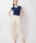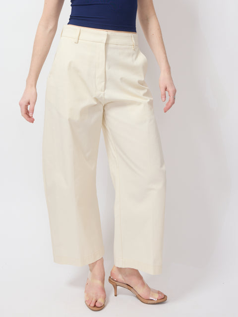 Barrel leg, zip front, welt side pockets, patch pockets in back. 12" rise, these are meant to be worn with a bit of ease so they slouch a bit - but wear them however they suit you! The inseam is 24". 97% cotton, 3% elastane. Machine wash cold, lay flat to dry. 38=US2 40=US4 42=US6 44=US8 46-US10. Lindsay is 5'6" and wearing the 38.