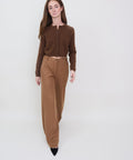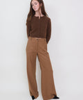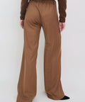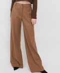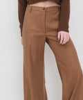 Effortless flat front trouser from Diega. Wool blend fabric and the perfect neutral tan, make these the pants you'll reach for. Side pockets and back elasticized waist ensure these are comfortable as well as good looking. Straight, wide leg. Unlined. 33% Wool, 33% Polyester, 33% Viscose, 1% Elastane. Hand wash or dry clean. Made in Morocco. Lindsay is 5'6" and wearing the XS.