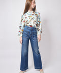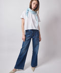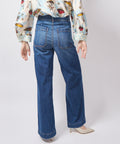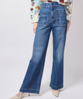 A high-rise, wide-leg jean that means business. Soft denim with a little stretch, flattering patch pockets, and a clean, elongated leg make this pair equal parts effortless and bold. Classic, cool, and built to carry an outfit. High rise and wide leg combine to make this one flattering pair of pants. 12" rise, 30" inseam, 20" leg opening. 98% cotton, 2% pu, 10oz Japanese denim. Lindsay is 5'6" and wearing the 25