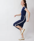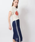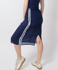 Sporty & flirty, this sheer navy chiffon skirt floats when you walk (and jump!) and stretches where it counts, thanks to an easy elastic waistband. Finished with crisp side stripes for that just-left-the-gym (but didn’t) energy. Comfy, breezy, and meant for fun. Elastic waistband, back slit. Lindsay is 5'6" and wearing the XS.