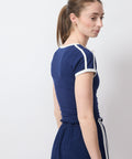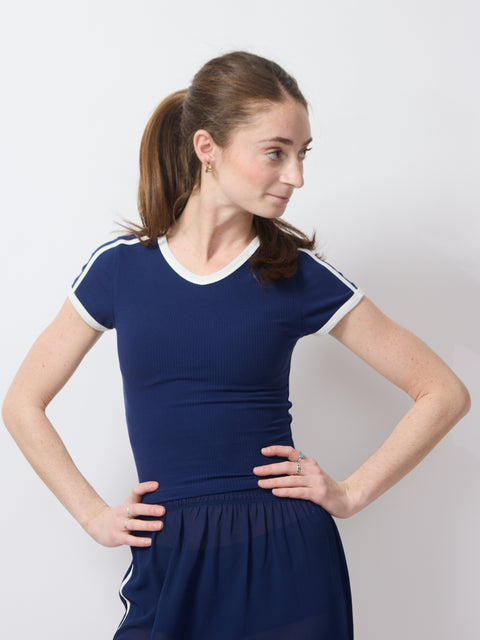 This fitted navy tee hugs just right with sporty contrast trim and a smooth, stretchy feel. Equal parts athletic and flirt, it looks like you’re headed to practice—whether that’s the gym or stealing the spotlight. 88% Tencel, 12% spandex. Machine wash cold, lay flat to dry. Lindsay is 5'6" and wearing the XS.