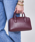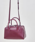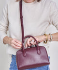 Quintessential handbag from WE-AR4 is rooted in classic lines. Bowling bag shape with top handles and double, two-way zipper compartments offer the style and function you want from a handbag. Adjustable crossbody strap updates the situation and converts this bag to hands-free. Smooth, luxe leather construction. Faille lining with silver hardware. Overall size: 8.5” L x 4.5” W x 5.5” H. Top handle drop, 3.5". Crossbody adjusts from 35-42".